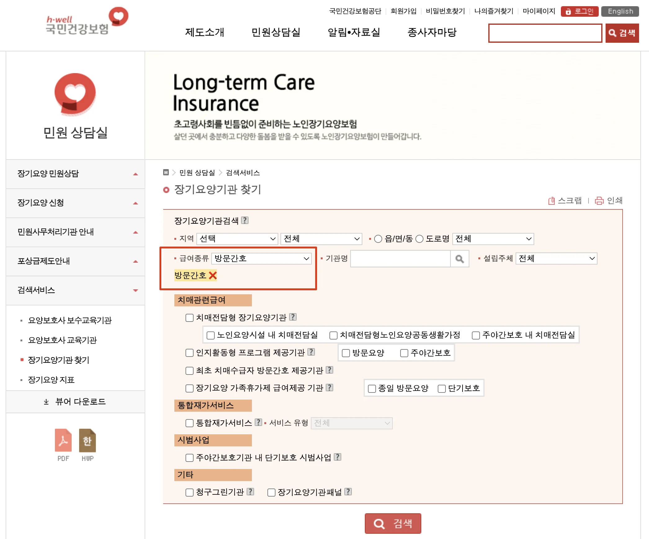 - 검색 경로: 홈페이지 → ‘장기요양기관 찾기’ → 급여종류에서 ‘방문간호’ 체크 후 지역 검색